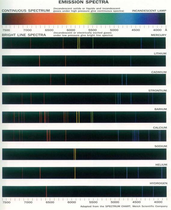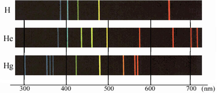 线状光谱是物质的原子所发,因此也叫原子光谱。不同的元素有不同的谱线分布。 |