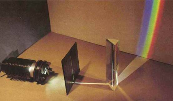 | 在1664年,牛顿就发现一束细小的太阳光在通过三棱镜后会分解成像彩虹那用的连续光带。牛顿把这种彩色的光带叫做光谱。 | ||||||||||||
